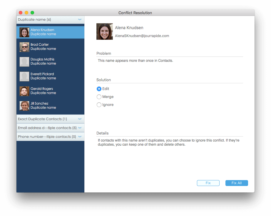 Step 4. If there are any dupes, the Conflict Resolution window will appear, listing the detected iCloud duplicate contacts and providing you with a few available solutions (Edit, Merge, Ignore, etc.). Choose a solution and click the Fix or Fix All button in the lower right corner of the window.