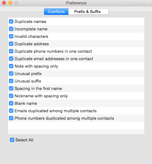 You can set this duplicate contact remover to find certain types of duplicate contacts. From the top menu bar, select Preferences > Conflicts. There you can set the app to detect or ignore types of contact duplicates.